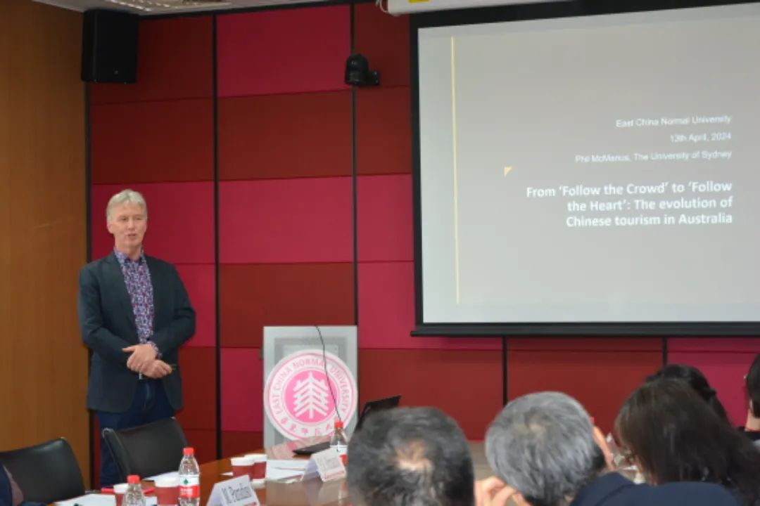 Phil McManus教授做了题为“从‘随波逐流’到‘随心而行’:中国旅游在澳大利亚之演化(From ‘Follow the Crowd’ to ‘Follow the Heart’: The evolution of Chinese tourism in Australia)”的学术报告,为其新近著作《澳大利亚的中国旅游(Chinese Tourism in Australia)》的一部分,指出进入澳大利亚的中国游客从团体游的“随波逐流”向个体游的“随心而行”、从参观标志性景点向参观“打卡景点”的转变,以及其中社交媒体在景观创造、即时传播、文化资产挖掘等方面的重要作用。