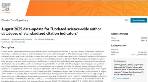2025年9月19日,美国斯坦福大学(Stanford University)和国际权威学术出版社爱思唯尔(Elsevier)共同发布2025年全球前2%顶尖科学家榜单(World's Top 2% Scientists)。榜单分为“终身科学影响力排行榜(Career-long Impact)”和“年度科学影响力排行榜(Single-year Impact)”两大部分,从全球近700万名科学家中,通过基于其论文引用数、h因子、合著者修正的hm因子等综合参数,遴选出世界排名前2%的科学家,涵盖22个领域和174个子领域。