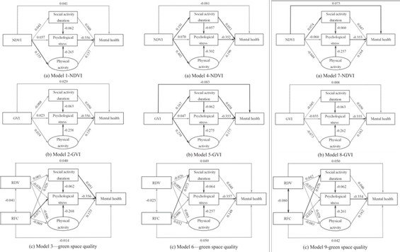 活动空间(模型4-6):活动空间中的绿地通过社交活动、体力活动和心理压力三条路径对心理健康产生作用。绿地数量(NDVI和GVI)能通过促进社交和体力活动,进而减轻心理压力来改善心理健康。同时,绿地质量(RFC)也能通过促进社交活动,进而减轻心理压力来改善心理健康 。