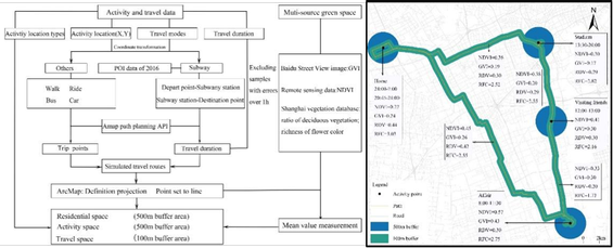 为了精确测量个体在不同地理情境中的绿地暴露,本研究结合了活动日志和高德地图路径规划API进行计算,分别设定了居住和活动空间为500米半径的圆形缓冲区,出行空间为100米宽的线性缓冲区(图2)。