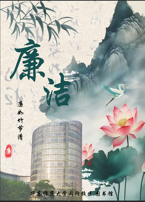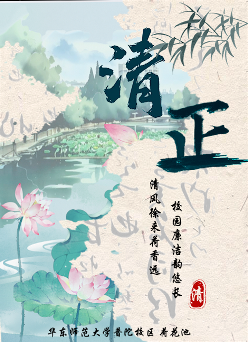 我们小组的实践作品是创意海报《清荷映日,墨韵廉香》,从校园景观和建筑中汲取廉洁意象进行创作。我们创作了两幅海报,希望从不同角度展现廉洁文化的丰富内涵。第一幅以普陀校区荷花池为主题,第二幅以闵行校区图书馆为核心,通过两校区不同的景观全面呈现华东师大廉洁文化的立体图景。海报一《清荷印日》以荷花池为背景,融入墨竹与"清正"书法。荷花"出淤泥而不染"象征纯洁品格,竹子"虚心有节"代表正直气节,共同诠释了"严以修身"的廉洁要求。这幅作品着重表现个人品德修养的廉洁内涵。海报二《墨韵廉香》以闵行校区图书馆为主体,配以青山、飞鸟等元素。图书馆象征知识的纯粹性,青山代表纪律的约束力,飞鸟寓意在规矩中追求理想。这幅作品更强调学术研究和校园生活中的廉洁准则。