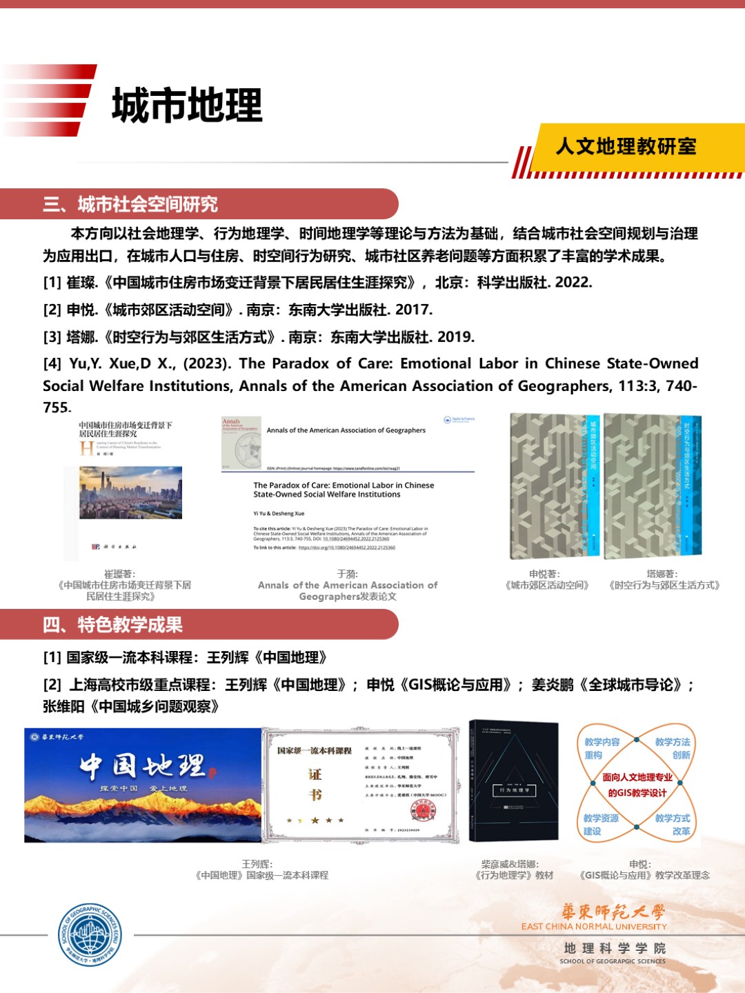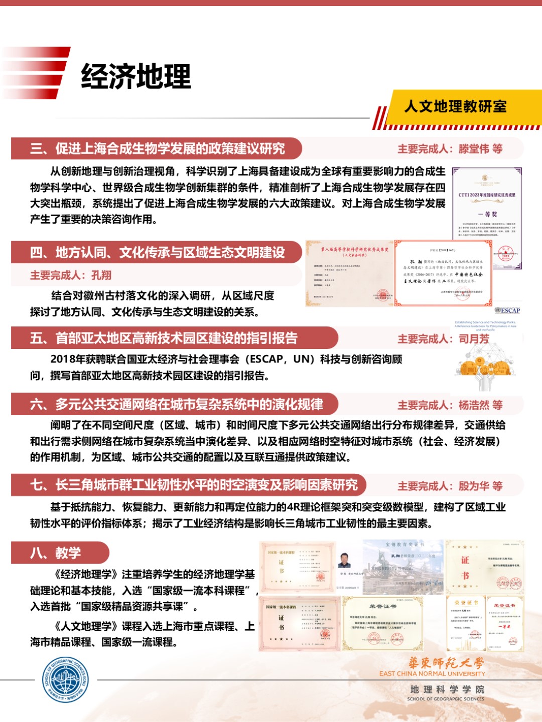 304am永利集团“人文地理学”专业由著名人文地理学家、首批上海社科大师胡焕庸、李春芬等先生奠基,是我国第一批人文地理学、区域地理学博士点和地理学博士后流动站设岗单位,国内师范类高校第一批设立国家基础研究与教学人才培养基地的单位,国家重点一级学科,上海首批重中之重建设学科,上海市高峰高原学科计划高峰II类学科。拥有教育部人文社科重点研究基地中国现代城市研究中心、教育部战略研究基地全球创新与发展研究院、民政部重点研究基地中国行政区划研究中心等多个研究基地。在经济地理与区域创新、城市地理与城市经济、世界地理与地缘战略、行政区划与城乡管治等领域形成了鲜明的特色,研究水平居全国领先地位,并与国内外众多学术机构建立了广泛的学术交流网络。人文地理教研室负责人文地理与城乡规划本科专业及地理学其他专业相关课程的教学组织工作。为适应中国新发展阶段对人才的战略需求,紧跟国际学术前沿,借鉴国外著名大学的相关课程设置,围绕自然地理学、人文地理学、区域经济学、地理空间技术和城乡规划学等五个主题组建了专业课程群。一流课程建设在国内同类专业中优势明显,《经济地理学》、《世界经济地理》、《人文地理学》、《中国地理》是国家级一流本科课程。为提高员工的实践研究能力,培养具有世界眼光,家国情怀的卓越老员工,在上海、苏州、黄山等长三角核心城市建立了若干实习基地,每年暑期分别安排了人文地理学实习、自然地理学实习、区域规划实习、城市规划实习与“一带一路”综合实习。本科毕业生除了选择在国内外著名学府继续攻读硕士学位外,还受到各级政府管理部门、大中城市重点中学、国内外知名规划设计机构与咨询研究机构等的广泛欢迎。